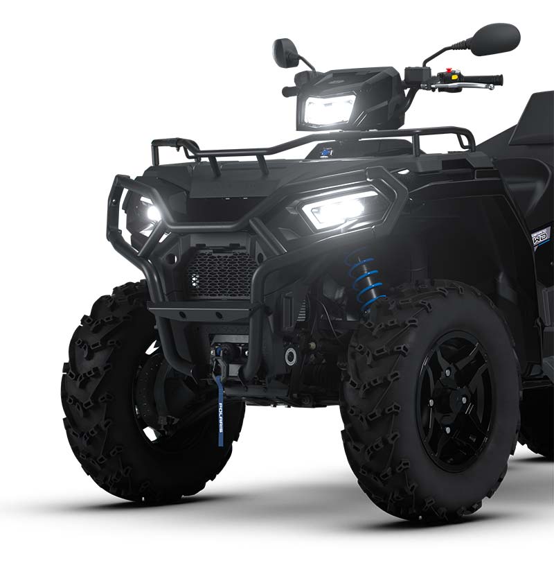 - 3 Modos de conducción: Estándar / Trabajo / Rendimiento, Enchufe de 12 voltios, puerto de carga lenta integrado, calentadores para manos y pulgares incluidos, sistema de seguridad activado por PIN (P.A.S.S.)., Cabrestante de 1,587 kgs con cuerda sintética y NUEVA función de parada automática, Protectores delanteros y traseros de los brazos en A, parachoques delantero trasero, extensor delantero del portaequipajes, rieles metálicos de la caja, plásticos pintados, protectores de manos.